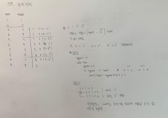 위에서 볼 수 있듯이, input에 일정한 값들을 대입하여 output을 관찰하면 일정한 규칙을 발견할 수 있는데, 이를 이용하여 알고리즘을 짜는 것이 세 번째 코드이다. 주목할 부분은 2의 제곱수인 부분에서의 처리가 까다롭다는 건데, 위 사진의 풀이1을 참고하면 쉽게 이해할 수 있을 것 같다.