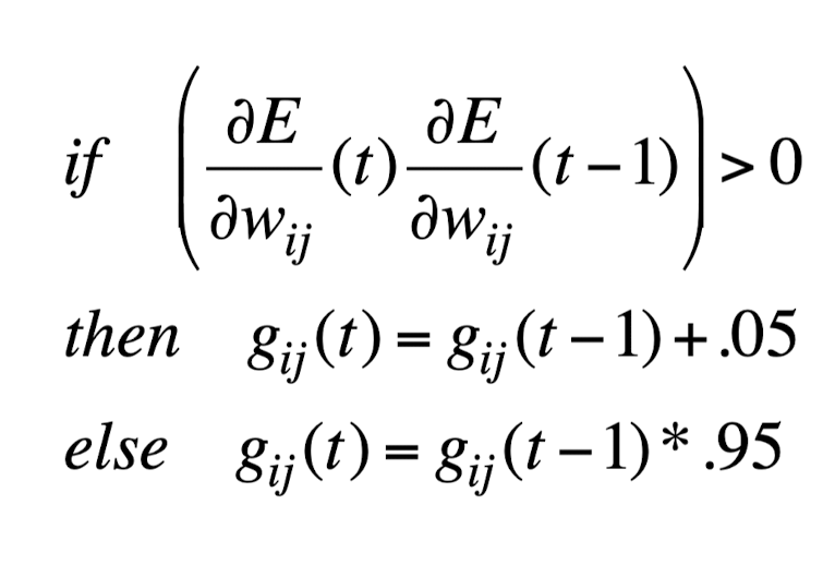 - 만약 현재 시점과 이전 시점의 gradient의 부호가 같다면 조금 더해주고, 다르다면 곱하여 감소시킴