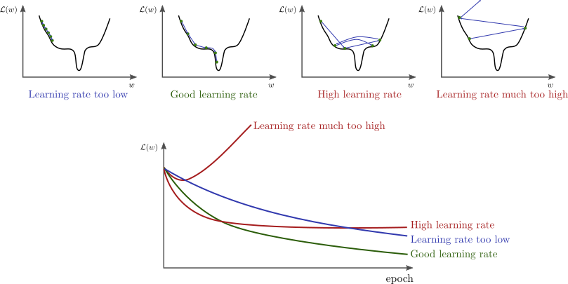 - learning rate가 매우 높으면 발산하거나 plateau에서 수렴하는 문제가 발생