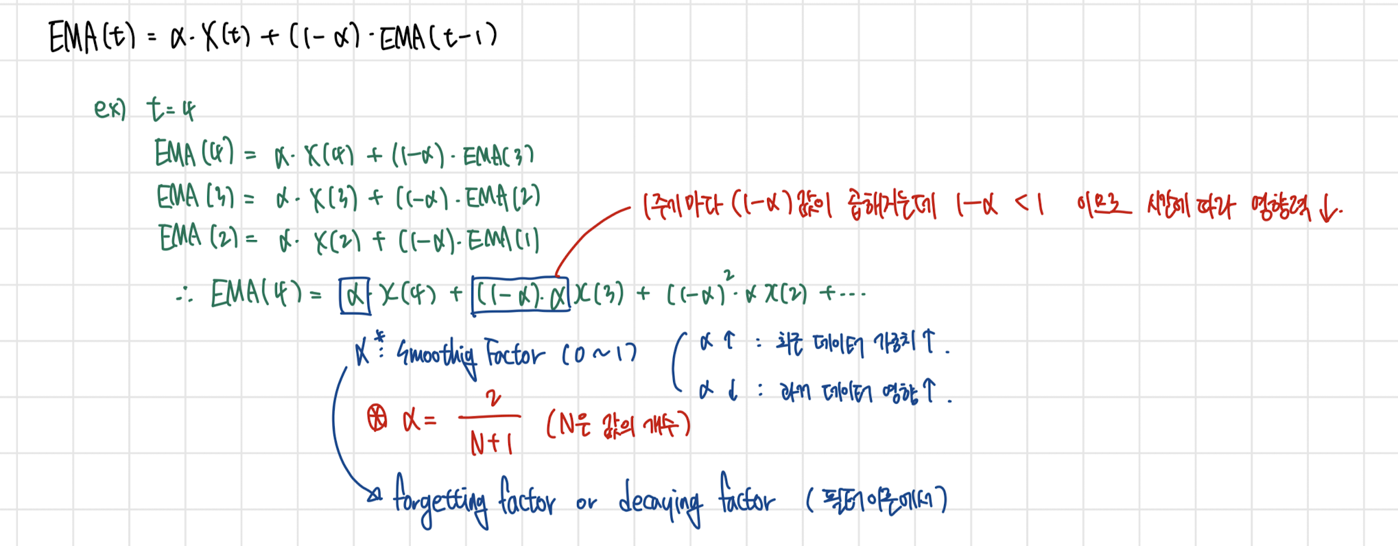 - 지수이동 평균(EMA)을 활용하여 최근 값을 더 잘 반영하도록 더 많은 가중치를 부여함